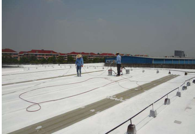 B、金属屋面的突出物(如烟囱、出气孔、风机口等):裁剪尺寸、形状合适的缝织聚酯布,并按技术要求裁剪好,在突出物周围涂一层基层涂料,把裁剪好的缝织聚酯布铺于其上,再从上面用基层涂料充分浸润缝织聚酯布,确保不起泡、不起皱。
